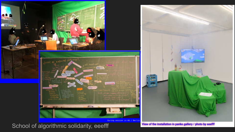 Based on the practices of eeefff — an artistic cooperation and made-up institution working across poetic computations and “infrastructures of imagination” — the lecture will focus on techno-politic-poetic imaginations and scenes of their unrolling. The duo will dive into their recent practice that includes: collective forms of dealing with technologies, general intellect/collective intelligences as an opposition to “artificial intelligence”; digital colonialism, or how bodies, being trapped in techno-capitalism, can try to turn it into strength. “Algosomatics,” the embodied dimension of life supported/exploited by computation, deals with how algorithmic-aided environments modulate bodies from one side and, from another, how “motor inventiveness” can repurpose these effects into forms of imagination.